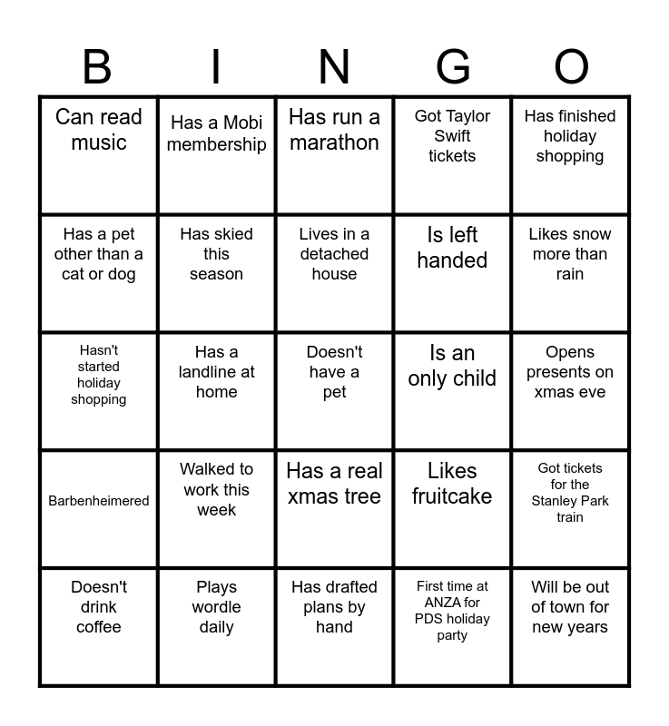 This bingo card has 25 words: Walked to work this week, Has drafted plans by hand, Lives in a detached house, Doesn't drink coffee, Has finished holiday shopping, Can read music, Has a pet other than a cat or dog, Has a Mobi membership, Is an only child, Has a real xmas tree, Is left handed, Hasn't started holiday shopping, Likes fruitcake, Got tickets for the Stanley Park train, Has skied this season, Will be out of town for new years, Opens presents on xmas eve, Has run a marathon, Likes snow more than rain, Has a landline at home, Doesn't have a pet, Plays wordle daily, Barbenheimered, Got Taylor Swift tickets and First time at ANZA for PDS holiday party.