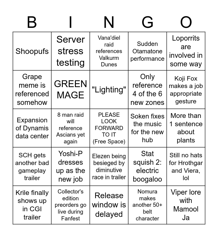 This bingo card has a free space and 24 words: Yoshi-P dresses up as the new job, Collector's edition preorders go live during Fanfest, "Lighting", Krile finally shows up in CGI trailer, Loporrits are involved in some way, Shoopufs, Grape meme is referenced somehow, Server stress testing, Soken fixes the music for the new hub, Elezen being besieged by diminutive race in trailer, Only reference 4 of the 6 new zones, Expansion of Dynamis data center, Stat squish 2: electric boogaloo, Still no hats for Hrothgar and Viera, lol, GREEN MAGE, Nomura makes another 50+ belt character, More than 1 sentence about plants, Vana'diel raid references Valkurm Dunes, Koji Fox makes a job appropriate gesture, 8 man raid will reference Ascians yet again, Viper lore with Mamool Ja, SCH gets another bad gameplay trailer, Sudden Otamatone performance and Release window is delayed.