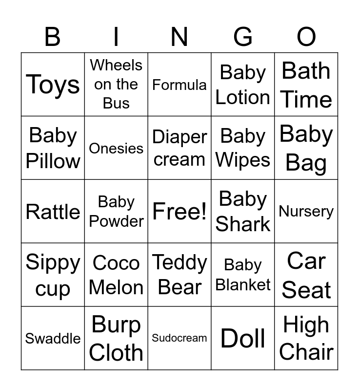 This bingo card has a free space and 39 words: Diaper, Baby Monitor, Bottle Warmer, Onesies, Swaddle, Teddy Bear, Diaper cream, Pacifier, Bath Time, Sippy cup, Baby Powder, Baby Lotion, High Chair, Nursery, Baby Shark, Coco Melon, Stroller, Toys, Avent - Baby Bottle, Baby Blanket, Baby Pillow, Sudocream, Baby Wipes, Baby Bag, Johnson and Johnson, Booties, Toy Box, Changing table, Diaper Genie, Wheels on the Bus, Bib, Diaper Pins, Formula, Burp Cloth, Doll, Lego, Car Seat, Rattle and Tummy Time.