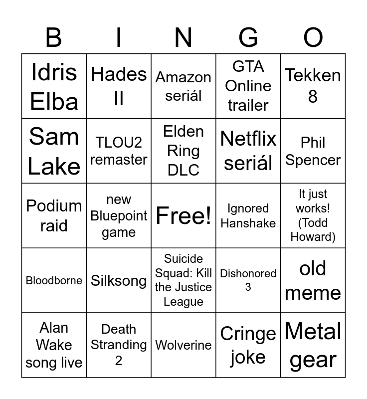 This bingo card has a free space and 24 words: Silksong, Death Stranding 2, Elden Ring DLC, Alan Wake song live, Tekken 8, Idris Elba, Sam Lake, Hades II, Ignored Hanshake, Suicide Squad: Kill the Justice League, Netflix seriál, Podium raid, Dishonored 3, old meme, TLOU2 remaster, Cringe joke, It just works! (Todd Howard), Amazon seriál, Phil Spencer, new Bluepoint game, Metal gear, Bloodborne, GTA Online trailer and Wolverine.