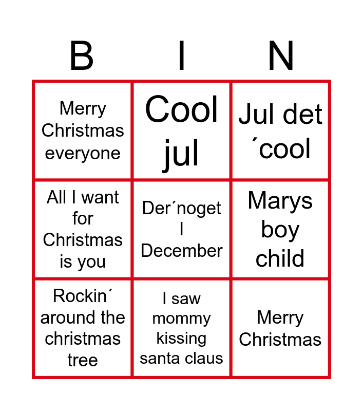 This bingo card has 34 words: Jesus og Josefine, Tinka, Santa tell me, Last Christmas, Driving home for Christmas, Rockin´ around the christmas tree, Der´noget I December, Santa Claus is coming to town, Cool jul, Højt fra træets grønne top, I saw mommy kissing santa claus, Jul det´cool, Guld jul, Wonderful Christmastime, Tag mig med, Hey mor, Jingle bell rock, Jul I angora, Jul I valhal, Søren Banjomus, Den himmelblå, Happy xmas (war Is over), Merry Christmas everyone, The støvledance, Misteltoe, Let it snow, let it snow, let it snow, All I want for Christmas is you, Når du ser et stjerneskud, Merry Christmas, Marys boy child, Sikken voldsom trængsel og alarm, Endelig jul igen, Kongespil and All alone on Christmas.
