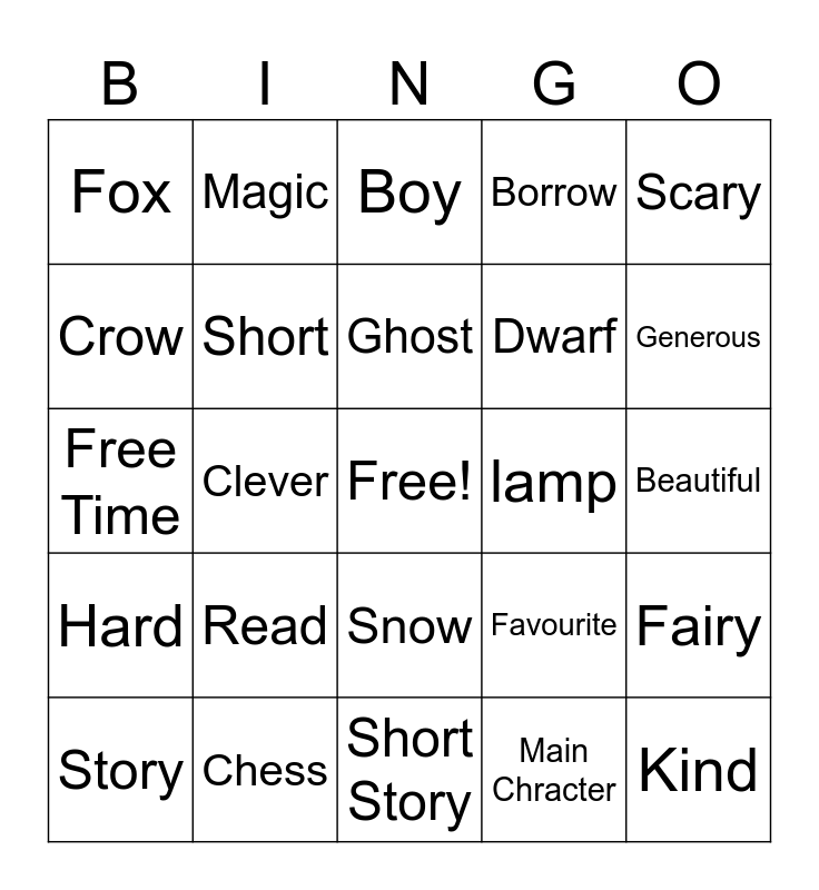 This bingo card has a free space and 24 words: Read, Chess, Ghost, Story, Scary, Fox, Crow, Magic, lamp, Snow, Dwarf, Free Time, Favourite, Fairy, Short, Main Chracter, Beautiful, Boy, Generous, Clever, Kind, Hard, Borrow and Short Story.