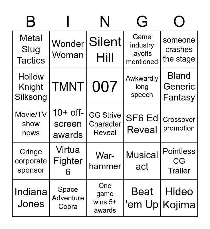 This bingo card has a free space and 24 words: Virtua Fighter 6, Space Adventure Cobra, 007, Indiana Jones, someone crashes the stage, Metal Slug Tactics, Hollow Knight Silksong, Wonder Woman, SF6 Ed Reveal, War-hammer, Awkwardly long speech, Movie/TV show news, Musical act, Pointless CG Trailer, TMNT, Beat 'em Up, Crossover promotion, Silent Hill, Bland Generic Fantasy, 10+ off-screen awards, Hideo Kojima, Cringe corporate sponsor, Game industry layoffs mentioned and One game wins 5+ awards.
