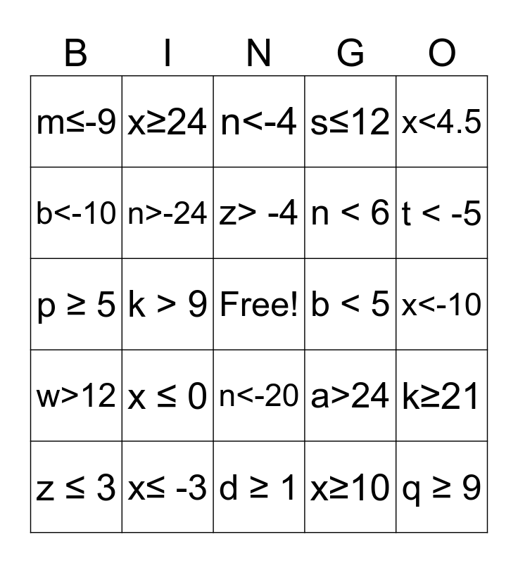 This bingo card has a free space and 24 words: x ≤ 0, x≤ -3, z> -4, z ≤ 3, x<4.5, m≤-9, b<-10, x≥24, b < 5, n<-20, n < 6, p ≥ 5, a>24, k≥21, n>-24, x≥10, x<-10, n<-4, t < -5, k > 9, q ≥ 9, w>12, s≤12 and d ≥ 1.