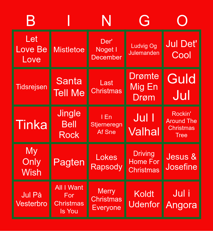 This bingo card has a free space and 24 words: Pagten, All I Want For Christmas Is You, Last Christmas, Jul På Vesterbro, Jul Det' Cool, Let Love Be Love, Tidsrejsen, Mistletoe, Jul I Valhal, Lokes Rapsody, Drømte Mig En Drøm, Tinka, Driving Home For Christmas, Jesus & Josefine, Santa Tell Me, Koldt Udenfor, Rockin' Around The Christmas Tree, Der' Noget I December, Guld Jul, Jingle Bell Rock, Jul i Angora, My Only Wish, Ludvig Og Julemanden and Merry Christmas Everyone.