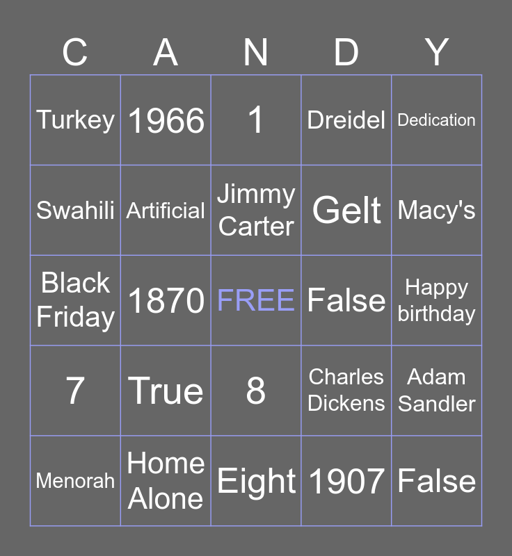 This bingo card has a free space and 33 words: The mid-1500s, Thanksgiving, 1870, Passover, 7, Artificial, Dedication, Menorah, 1966, Black, red, and green, Jimmy Carter, 1, Kinara, 1,000, False, Macy's, Home Alone, Black Friday, True, Charles Dickens, 8, His hat, Turkey, Happy birthday, Eight, False, Dreidel, Gelt, Swahili, Adam Sandler, Watts, 1907 and Dick Clark.