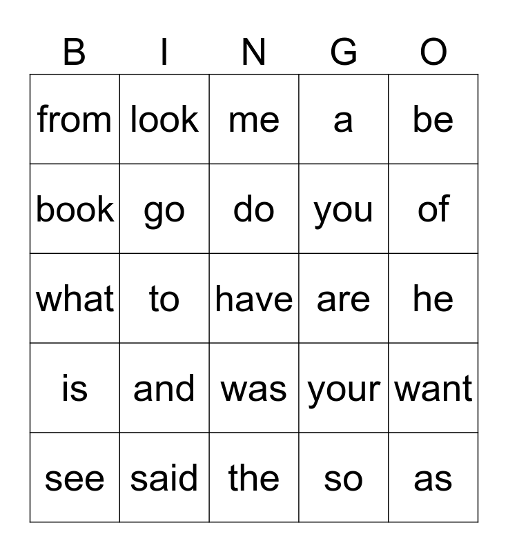 This bingo card has a free space and 24 words: and, said, do, see, be, from, book, look, are, was, you, what, your, want, go, so, he, me, of, to, as, is, a and the.