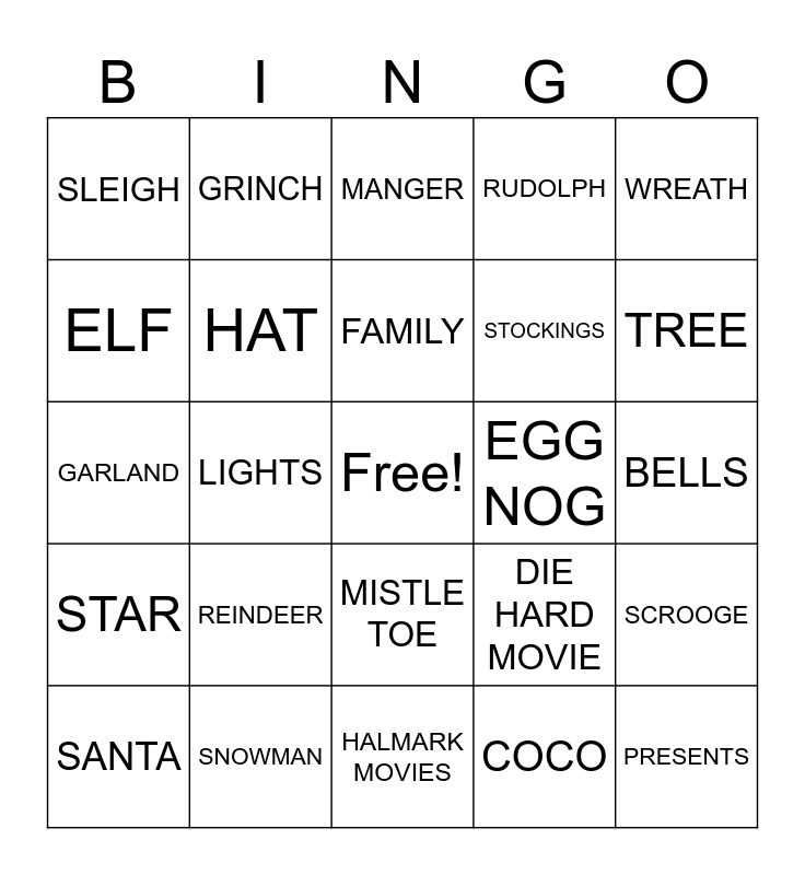 This bingo card has a free space and 29 words: SANTA, CANDY CANE, LIGHTS, MRS. CLAUSE, SLEIGH, MANGER, HAT, REINDEER, EGG NOG, SNOWMAN, BELLS, PRESENTS, HALMARK MOVIES, COCO, TREE, ORNAMENTS, MISTLE TOE, STAR, WREATH, GARLAND, DIE HARD MOVIE, COOKIES, STOCKINGS, ELF, RUDOLPH, GRINCH, SCROOGE, FAMILY and TRADITIONS.