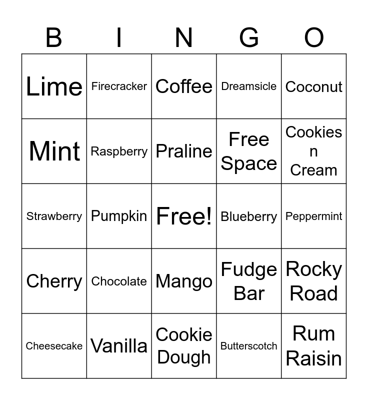 This bingo card has a free space and 25 words: Chocolate, Cookie Dough, Praline, Cheesecake, Coconut, Lime, Mint, Firecracker, Blueberry, Mango, Free Space, Strawberry, Fudge Bar, Rocky Road, Raspberry, Orange Sherbet, Peppermint, Coffee, Cookies n Cream, Pumpkin, Rum Raisin, Vanilla, Cherry, Dreamsicle and Butterscotch.
