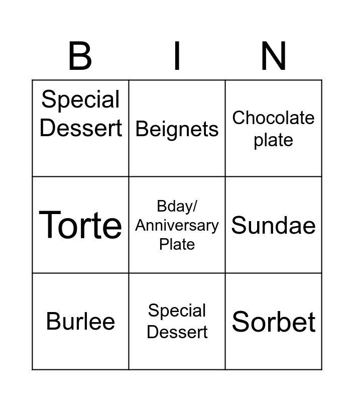 This bingo card has a free space and 8 words: Torte, Beignets, Sundae, Burlee, Chocolate plate, Special Dessert, Special Dessert and Sorbet.