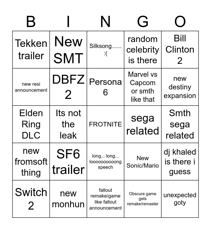This bingo card has a free space and 24 words: SF6 trailer, new monhun, Persona 6, Switch 2, Bill Clinton 2, Tekken trailer, new resi announcement, New SMT, sega related, long... long... loooooooooong speech, Marvel vs Capcom or smth like that, Elden Ring DLC, New Sonic/Mario, dj khaled is there i guess, DBFZ 2, Obscure game gets remake/remaster, Smth sega related, Silksong...... :(, new destiny expansion, Its not the leak, unexpected goty, new fromsoft thing, random celebrity is there and fallout remake/game like fallout announcement.