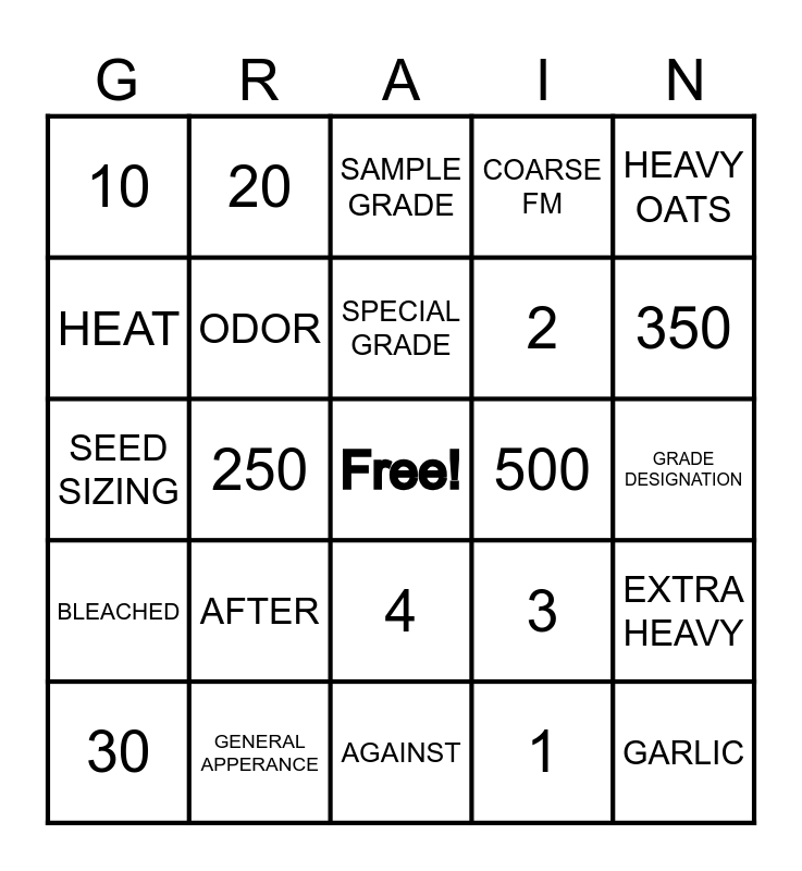 This bingo card has a free space and 27 words: 3, WEATHER, 2, AGAINST, HEAT, SAMPLE GRADE, 20, BLEACHED, 500, EXTRA HEAVY, SEED SIZING, COARSE FM, 30, GENERAL APPERANCE, 350, HEAT DAMAGE, ODOR, SPECIAL GRADE, AFTER, 10, GRADE DESIGNATION, 1, 250, GARLIC, 4, HEAVY OATS and BRIGHT OATS.