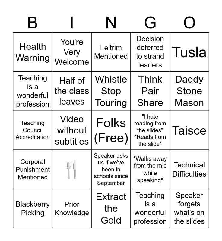 This bingo card has a free space and 25 words: 🍴, Extract the Gold, Whistle Stop Touring, Blackberry Picking, Tusla, Health Warning, Teaching is a wonderful profession, You're Very Welcome, "I hate reading from the slides" *Reads from the slide*, Speaker asks us if we've been in schools since September, Think Pair Share, Teaching Council Accreditation, *Walks away from the mic while speaking*, Technical Difficulties, Half of the class leaves, *Shows the schedule for School Placement*, Taisce, Leitrim Mentioned, Daddy Stone Mason, Video without subtitles, Speaker forgets what's on the slides, Prior Knowledge, Corporal Punishment Mentioned, Decision deferred to strand leaders and Teaching is a wonderful profession.