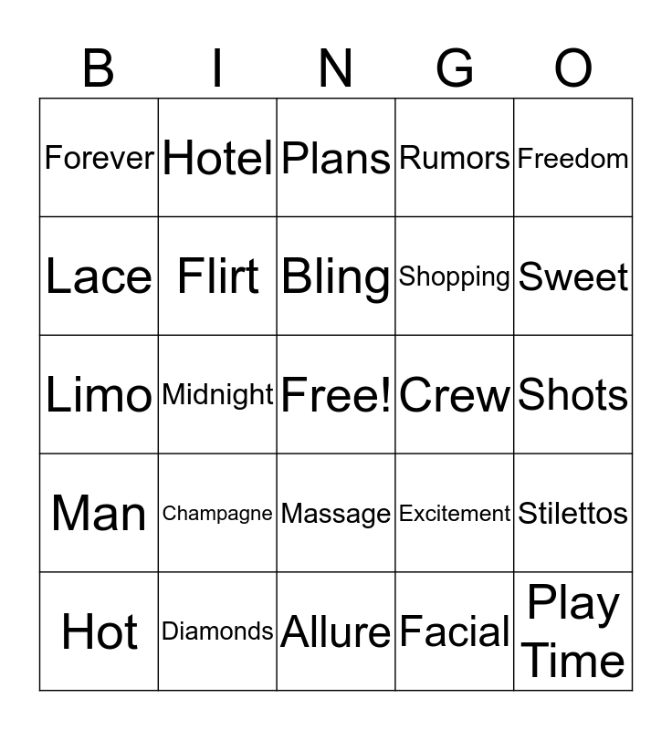 This bingo card has a free space and 24 words: Champagne, Diamonds, Bling, Hot, Freedom, Forever, Lace, Hotel, Crew, Massage, Shopping, Limo, Excitement, Stilettos, Flirt, Facial, Shots, Plans, Sweet, Midnight, Play Time, Man, Rumors and Allure.