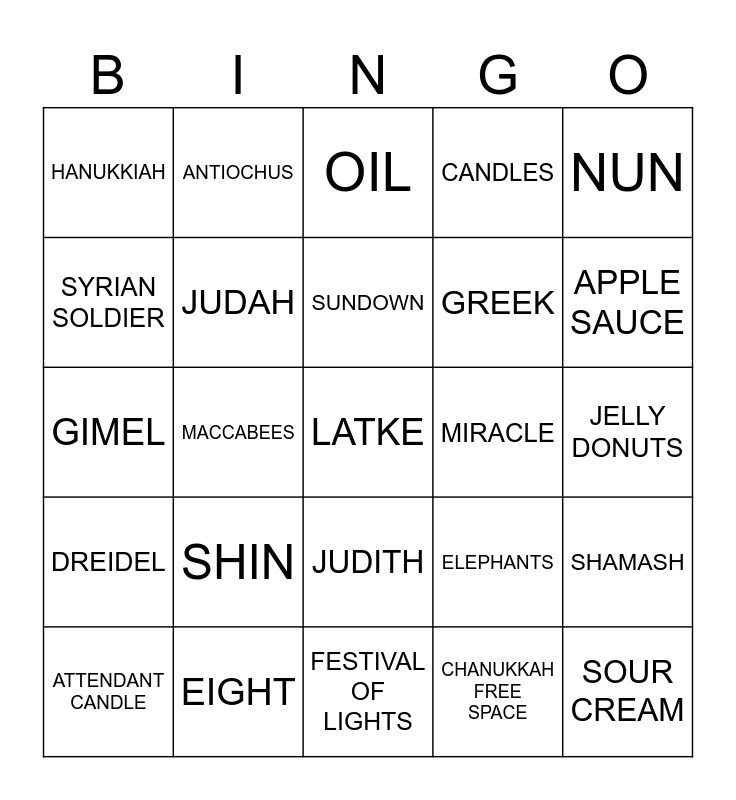 This bingo card has 30 words: EIGHT, GELT, MACCABEES, LIGHT, HANUKKIAH, OIL, JUDAH, JUDITH, MIRACLE, FESTIVAL OF LIGHTS, JELLY DONUTS, LATKE, CHANUKKAH FREE SPACE, SOUR CREAM, APPLE SAUCE, TORAH, ELEPHANTS, DREIDEL, SHIN, NUN, GIMEL, HEY, ANTIOCHUS, GREEK, SYRIAN SOLDIER, CANDLES, SHAMASH, ATTENDANT CANDLE, SUNDOWN and REDEDICATION.