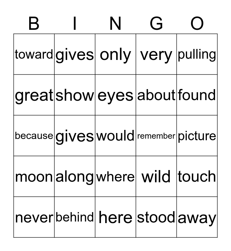 This bingo card has a free space and 24 words: along, behind, eyes, never, pulling, toward, great, gives, remember, where, about, because, wild, touch, show, stood, picture, only, found, gives, away, moon, very and here.