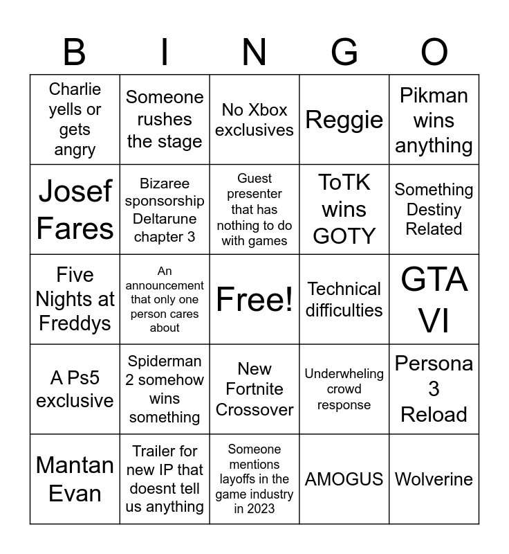 This bingo card has a free space and 26 words: New Fortnite Crossover, AMOGUS, Guest presenter that has nothing to do with games, Trailer for new IP that doesnt tell us anything, Pikman wins anything, Charlie yells or gets angry, Josef Fares, Someone rushes the stage, GTA VI, Underwheling crowd response, ToTK wins GOTY, Five Nights at Freddys, Persona 3 Reload, Mantan Evan, An announcement that only one person cares about, Last of Us season 2, Reggie, A Ps5 exclusive, No Xbox exclusives, Wolverine, Something Destiny Related, Someone mentions layoffs in the game industry in 2023, Technical difficulties, Spiderman 2 somehow wins something, Bizaree sponsorship Deltarune chapter 3 and Mind blowing Nintendo announcement.