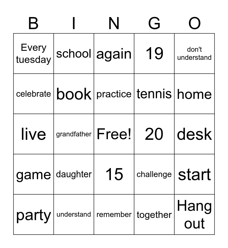 This bingo card has a free space and 44 words: Amanda, Hang out, family, party, play, together, again, don't know, don't understand, understand, 19, 20, 15, daughter, Alabama, remember, grow, live, wrong, home, school, study, Tuesday, Every tuesday, alaska, desk, basketball, volleyball, challenge, game, soccer, start, skill, win, grandfather, obvious, meaning, confused, practice, celebrate, tennis, name, book and want.