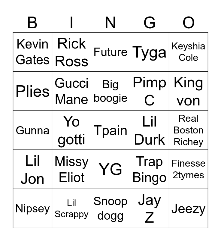 This bingo card has 25 words: Missy Eliot, Snoop dogg, Big boogie, Nipsey, Keyshia Cole, Kevin Gates, Plies, Rick Ross, Lil Durk, YG, Pimp C, Gunna, Trap Bingo, Finesse 2tymes, Gucci Mane, Jeezy, Real Boston Richey, Future, King von, Yo gotti, Tpain, Lil Scrappy, Lil Jon, Tyga and Jay Z.