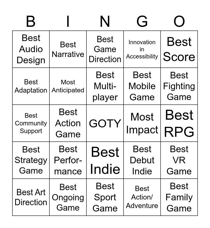 This bingo card has a free space and 24 words: Best Perfor- mance, Best Ongoing Game, Best Multi- player, Best Art Direction, Best Score, Best Audio Design, Best Adaptation, Best Narrative, Most Impact, Best Indie, Best Mobile Game, Best Community Support, Best Debut Indie, Best VR Game, Most Anticipated, Best Action/ Adventure, Best RPG, Best Game Direction, Best Fighting Game, Best Action Game, Best Family Game, Best Strategy Game, Innovation in Accessibility and Best Sport Game.