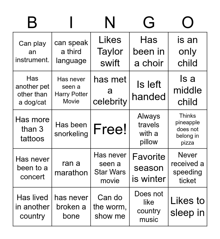 This bingo card has a free space and 24 words: ran a marathon, has never broken a bone, has met a celebrity, Has lived in another country, is an only child, Can play an instrument., Has another pet other than a dog/cat, can speak a third language, Always travels with a pillow, Has never seen a Star Wars movie, Is left handed, Has more than 3 tattoos, Favorite season is winter, Never received a speeding ticket, Has never seen a Harry Potter Movie, Does not like country music, Thinks pineapple does not belong in pizza, Likes Taylor swift, Is a middle child, Has been snorkeling, Likes to sleep in, Has never been to a concert, Has been in a choir and Can do the worm, show me.