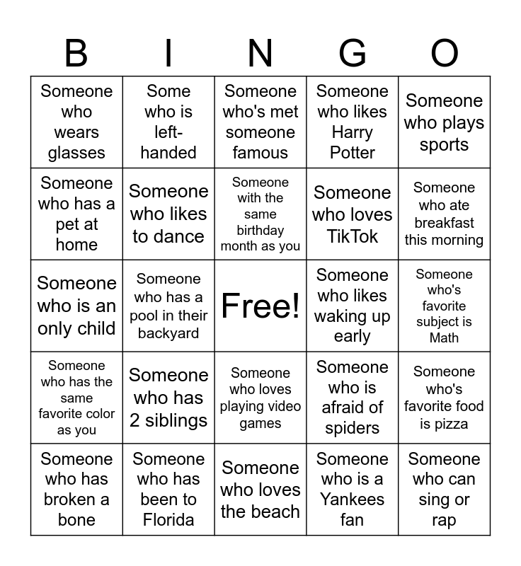 This bingo card has a free space and 24 words: Someone who has 2 siblings, Someone who has been to Florida, Someone with the same birthday month as you, Someone who has broken a bone, Someone who plays sports, Someone who wears glasses, Someone who has a pet at home, Some who is left-handed, Someone who likes waking up early, Someone who loves playing video games, Someone who loves TikTok, Someone who is an only child, Someone who is afraid of spiders, Someone who's favorite food is pizza, Someone who likes to dance, Someone who is a Yankees fan, Someone who's favorite subject is Math, Someone who's met someone famous, Someone who ate breakfast this morning, Someone who has a pool in their backyard, Someone who can sing or rap, Someone who has the same favorite color as you, Someone who likes Harry Potter and Someone who loves the beach.