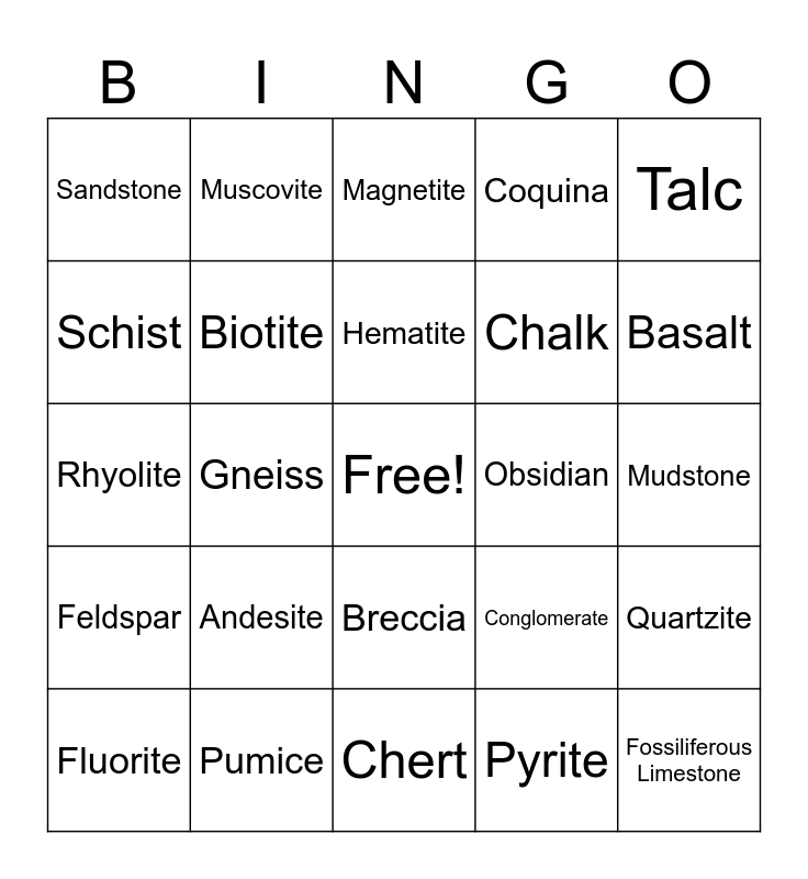 This bingo card has a free space and 34 words: Quartz, Pyrite, Calcite, Sulfur, Feldspar, Biotite, Talc, Fluorite, Muscovite, Galena, Hematite, Magnetite, Granite, Gabbro, Obsidian, Basalt, Pumice, Rhyolite, Andesite, Conglomerate, Breccia, Shale, Sandstone, Mudstone, Chert, Fossiliferous Limestone, Coquina, Coal, Chalk, Schist, Marble, Gneiss, Quartzite and Slate.