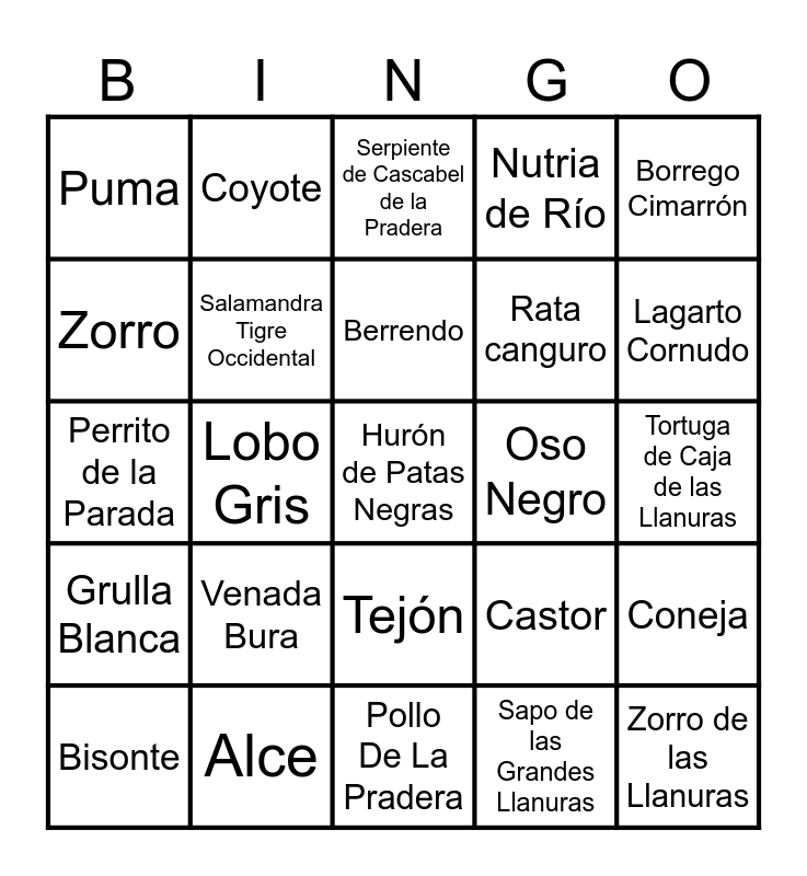This bingo card has a free space and 24 words: Venada Bura, Alce, Berrendo, Bisonte, Borrego Cimarrón, Puma, Zorro, Coyote, Oso Negro, Tejón, Rata canguro, Perrito de la Parada, Castor, Coneja, Salamandra Tigre Occidental, Sapo de las Grandes Llanuras, Tortuga de Caja de las Llanuras, Serpiente de Cascabel de la Pradera, Lagarto Cornudo, Lobo Gris, Zorro de las Llanuras, Grulla Blanca, Nutria de Río and Pollo De La Pradera.