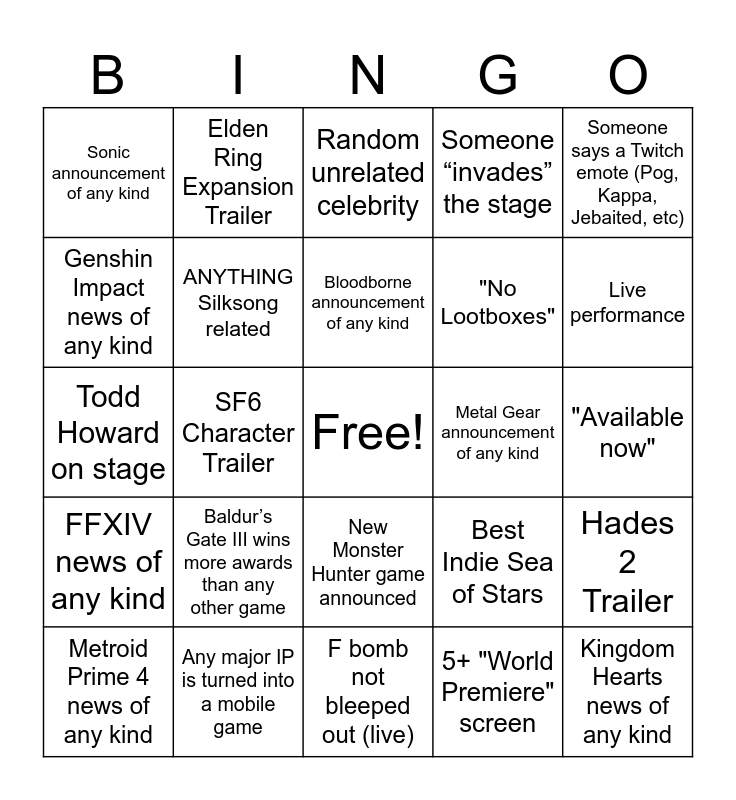 This bingo card has a free space and 24 words: Baldur’s Gate III wins more awards than any other game, Any major IP is turned into a mobile game, Bloodborne announcement of any kind, Metroid Prime 4 news of any kind, Someone says a Twitch emote (Pog, Kappa, Jebaited, etc), Sonic announcement of any kind, Genshin Impact news of any kind, Elden Ring Expansion Trailer, Metal Gear announcement of any kind, New Monster Hunter game announced, "No Lootboxes", Todd Howard on stage, Best Indie Sea of Stars, Hades 2 Trailer, ANYTHING Silksong related, 5+ "World Premiere" screen, "Available now", Random unrelated celebrity, Live performance, SF6 Character Trailer, Kingdom Hearts news of any kind, FFXIV news of any kind, Someone “invades” the stage and F bomb not bleeped out (live).
