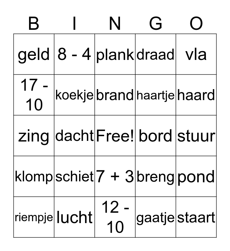 This bingo card has a free space and 58 words: denk, lucht, ja, klomp, gaatje, mand, koekje, lampje, haartje, poortje, draad, nu, stad, rand, sport, geld, staart, vla, vlecht, brand, bord, plank, riempje, pond, klasje, stuur, schaar, plank, haard, hoekje, sterk, kring, kleur, sla, houd, blauw, knijp, dacht, zing, balk, schiet, duimpje, breng, hoest, kurk, pluis, recht, 7 + 3, 12 - 10, 6 - 3, 15 - 10, 5 + 4, 4 + 4, 11 - 10, 8 - 4, 10 - 4, 17 - 10 and 20 - 20.