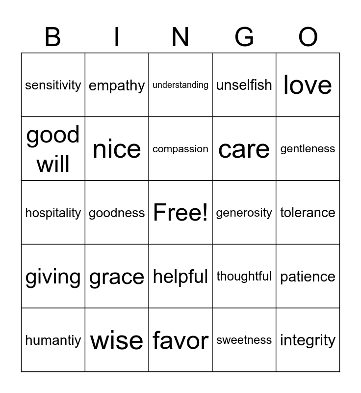 This bingo card has a free space and 25 words: grace, favor, compassion, humantiy, love, sensitivity, good will, empathy, generosity, helpful, care, hospitality, thoughtful, patience, nice, pleasant, tolerance, understanding, gentleness, goodness, integrity, wise, giving, unselfish and sweetness.