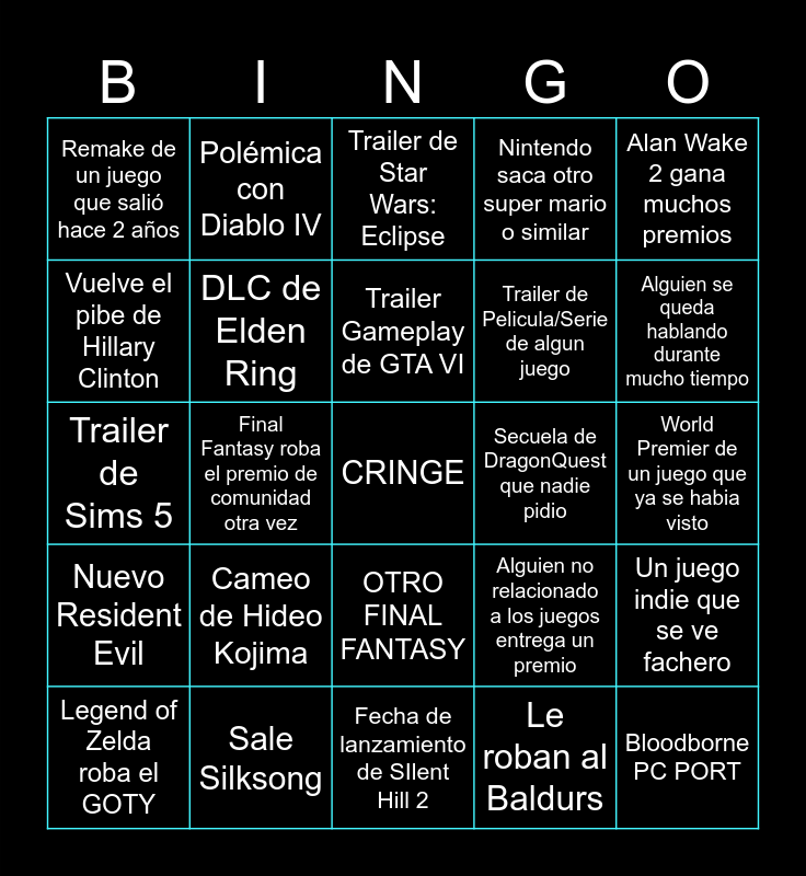 This bingo card has a free space and 24 words: Cameo de Hideo Kojima, Sale Silksong, Trailer Gameplay de GTA VI, Legend of Zelda roba el GOTY, Alan Wake 2 gana muchos premios, Remake de un juego que salió hace 2 años, Vuelve el pibe de Hillary Clinton, Polémica con Diablo IV, Secuela de DragonQuest que nadie pidio, OTRO FINAL FANTASY, Trailer de Pelicula/Serie de algun juego, Trailer de Sims 5, Alguien no relacionado a los juegos entrega un premio, Un juego indie que se ve fachero, DLC de Elden Ring, Le roban al Baldurs, World Premier de un juego que ya se habia visto, Trailer de Star Wars: Eclipse, Alguien se queda hablando durante mucho tiempo, Final Fantasy roba el premio de comunidad otra vez, Bloodborne PC PORT, Nuevo Resident Evil, Nintendo saca otro super mario o similar and Fecha de lanzamiento de SIlent Hill 2.