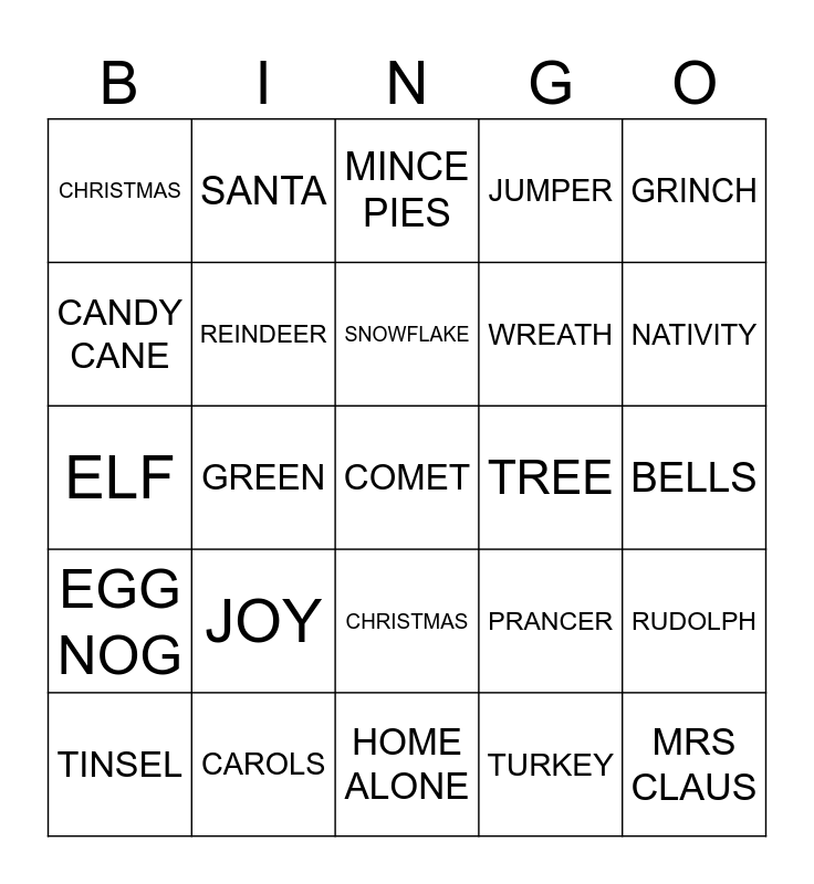 This bingo card has a free space and 24 words: JOY, CAROLS, SNOWFLAKE, TINSEL, GRINCH, CHRISTMAS, CANDY CANE, SANTA, TREE, CHRISTMAS, WREATH, ELF, PRANCER, RUDOLPH, REINDEER, TURKEY, BELLS, MINCE PIES, NATIVITY, GREEN, MRS CLAUS, EGG NOG, JUMPER and HOME ALONE.
