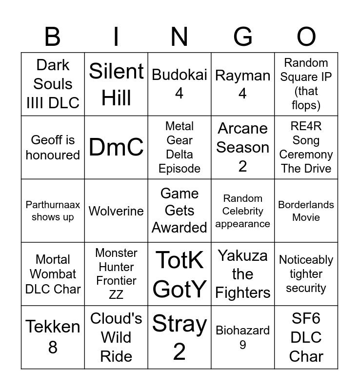 This bingo card has a free space and 24 words: Monster Hunter Frontier ZZ, Cloud's Wild Ride, Metal Gear Delta Episode, Tekken 8, Random Square IP (that flops), Dark Souls IIII DLC, Geoff is honoured, Silent Hill, Random Celebrity appearance, TotK GotY, Arcane Season 2, Parthurnaax shows up, Yakuza the Fighters, Noticeably tighter security, DmC, Biohazard 9, Borderlands Movie, Budokai 4, RE4R Song Ceremony The Drive, Wolverine, SF6 DLC Char, Mortal Wombat DLC Char, Rayman 4 and Stray 2.