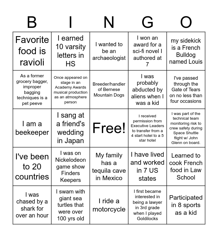 This bingo card has a free space and 24 words: I was on Nickelodeon game show Finders Keepers, I swam with giant sea turtles that were over 100 yrs old, Breeder/handler of Bernese Mountain Dogs, I was chased by a shark for over an hour, my sidekick is a French Bulldog named Louis, Favorite food is ravioli, As a former grocery bagger, improper bagging techniques is a pet peeve, I earned 10 varsity letters in HS, I received permission from Executive Leaders to transfer from a 4 start hotel to a 5 star hotel, My family has a tequila cave in Mexico, I was probably abducted by aliens when I was a kid, I am a beekeeper, I have lived and worked in 7 US states, Learned to cook French food in Law School, Once appeared on stage in an Academy Awards musical production as an atmosphere person, I first became interested in being a lawyer in 3rd grade when I played Goldilocks, I was part of the technical team monitoring risk to crew safety during Space Shuttle flight w/ John Glenn on board., I wanted to be an archaeologist, I've passed through the Gate of Tears on no less than four occasions, I sang at a friend's wedding in Japan, Participated in 8 sports as a kid, I've been to 20 countries, I won an award for a sci-fi novel I authored at 7 and I ride a motorcycle.