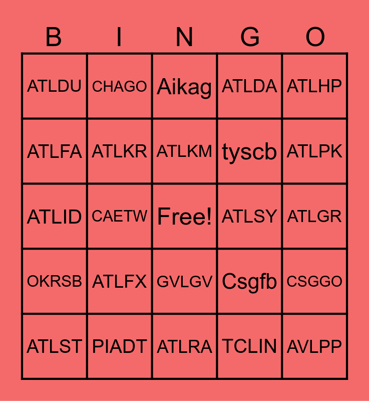 This bingo card has a free space and 81 words: AGSAV, AHNCM, Aikag, AIKNA, ATLAP, ATLAR, ATLAW, ATLBE, ATLCD, ATLCD / ATLFC, ATLCP, ATLCR, ATLDA, ATLDU, ATLEV, ATLFA, ATLFR, ATLFX, ATLGA, ATLGR, ATLHD, ATLHP, ATLID, ATLKM, ATLKR, ATLLA, ATLLG, ATLMU, ATLNN, ATLPA, ATLPK, ATLPT, ATLRA, ATLRC, ATLST, ATLSY, ATLUH, AVLBM, AVLEA, AVLIN, AVLPP, BNAMU, CAEGF, CAELX, CAETW, CHACL, CHAGO, CHAHN, CHAPH, CSGCW, Csgfb, CSGGO, CSGVD, DGLGA, DHNDO, DNNDN, DSBNC, GFNSC, GSPGG, GSPSC, GVLGV, HKYBO, Iroal, MCNCW, MCNPY, MCNRP, MGMBC, MGMCP, MMIAT, NBYEX, OKRIT, OKRSB, PIADT, PXCAL, SAVBE, SAVPC, SAVPW, TCLIN, TCLUA, tyscb and TYSLE.