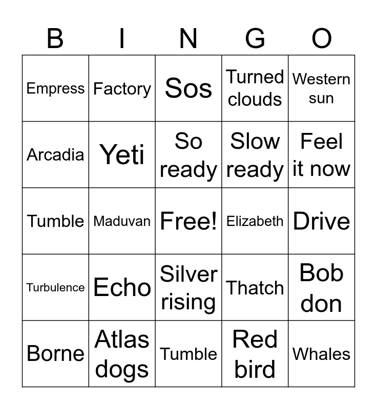 This bingo card has a free space and 24 words: Echo, Atlas dogs, So ready, Borne, Western sun, Empress, Arcadia, Factory, Elizabeth, Silver rising, Slow ready, Tumble, Thatch, Bob don, Yeti, Red bird, Drive, Sos, Feel it now, Maduvan, Whales, Turbulence, Turned clouds and Tumble.