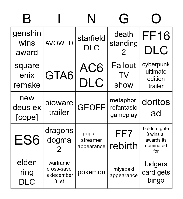 This bingo card has a free space and 24 words: dragons dogma 2, warframe cross-save is december 31st, AC6 DLC, elden ring DLC, FF16 DLC, genshin wins award, square enix remake, AVOWED, metaphor: refantasio gameplay, popular streamer appearance, Fallout TV show, new deus ex [cope], FF7 rebirth, baldurs gate 3 wins all awards its nominated for, GTA6, miyazaki appearance, doritos ad, starfield DLC, cyberpunk ultimate edition trailer, bioware trailer, ludgers card gets bingo, ES6, death standing 2 and pokemon.