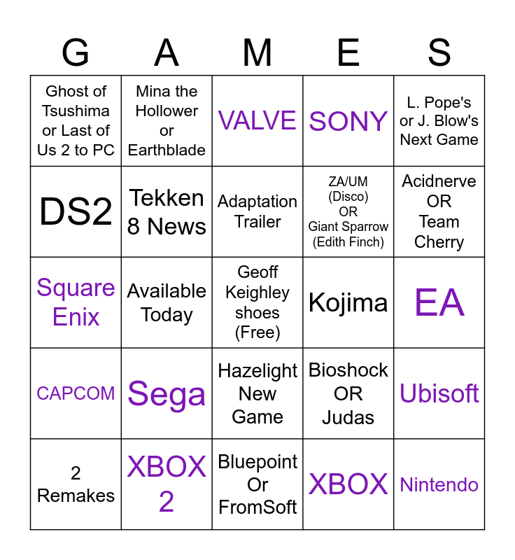 This bingo card has a free space and 24 words: 2 Remakes, Sega, Adaptation Trailer, XBOX, L. Pope's or J. Blow's Next Game, Ghost of Tsushima or Last of Us 2 to PC, Mina the Hollower or Earthblade, VALVE, Kojima, EA, Square Enix, Tekken 8 News, Bioshock OR Judas, Ubisoft, DS2, XBOX 2, Bluepoint Or FromSoft, SONY, Acidnerve OR Team Cherry, CAPCOM, Available Today, Hazelight New Game, ZA/UM (Disco) OR Giant Sparrow (Edith Finch) and Nintendo.