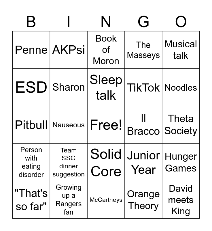 This bingo card has a free space and 24 words: Team SSG dinner suggestion, Growing up a Rangers fan, Sleep talk, "That's so far", Musical talk, Penne, ESD, AKPsi, Il Bracco, Solid Core, TikTok, Pitbull, Junior Year, Hunger Games, Sharon, Orange Theory, Theta Society, Book of Moron, Noodles, Nauseous, David meets King, Person with eating disorder, The Masseys and McCartneys.
