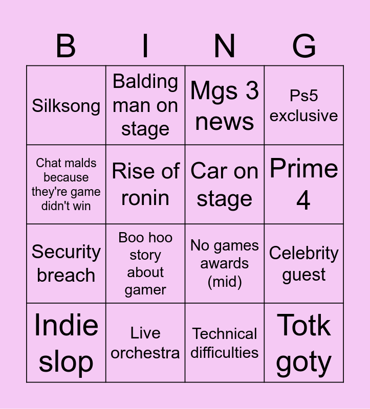 This bingo card has 17 words: Indie slop, Live orchestra, Mgs 3 news, Ps5 exclusive, Security breach, Rise of ronin, No games awards (mid), Prime 4, Chat malds because they're game didn't win, Boo hoo story about gamer, Technical difficulties, Celebrity guest, Silksong, Balding man on stage, Car on stage, Totk goty and Boo hoo sad story about gamer.