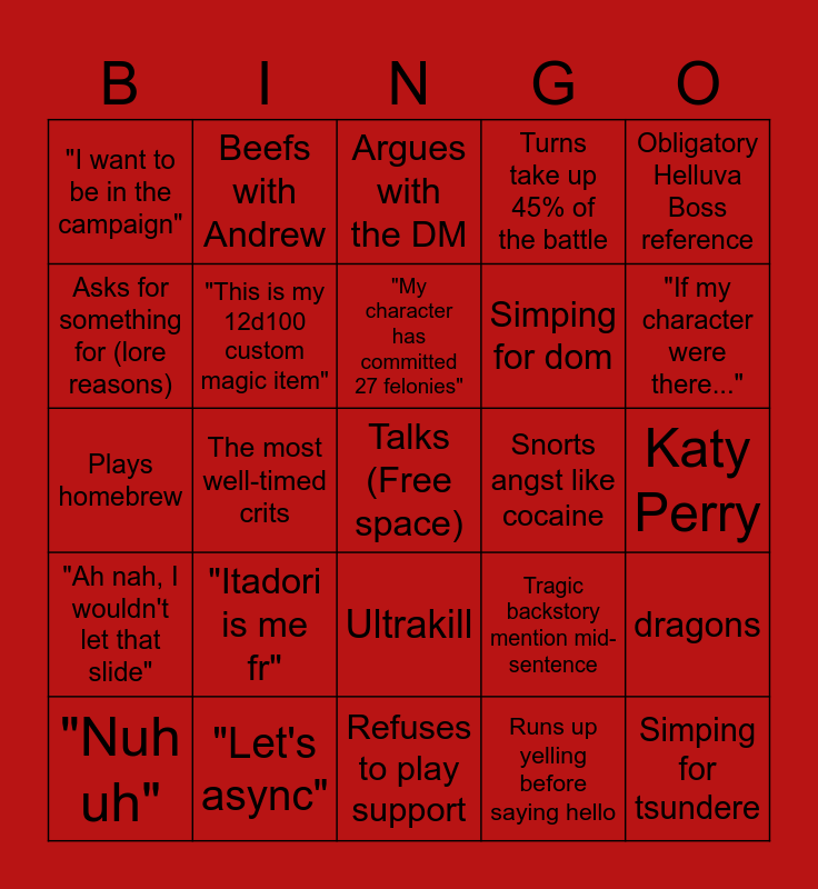 This bingo card has a free space and 24 words: "Nuh uh", "Itadori is me fr", "My character has committed 27 felonies", Runs up yelling before saying hello, Obligatory Helluva Boss reference, "I want to be in the campaign", Beefs with Andrew, Argues with the DM, Snorts angst like cocaine, Katy Perry, Plays homebrew, "This is my 12d100 custom magic item", Tragic backstory mention mid-sentence, dragons, Asks for something for (lore reasons), "Let's async", Refuses to play support, Turns take up 45% of the battle, "If my character were there...", "Ah nah, I wouldn't let that slide", The most well-timed crits, Ultrakill, Simping for dom and Simping for tsundere.