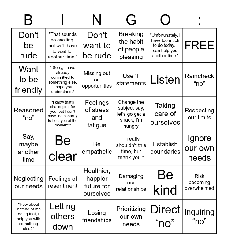 This bingo card has 42 words: Direct ‘no”, " Sorry, I have already committed to something else. I hope you understand.", Conditioned to be polite, Taking care of ourselves, Ignore our own needs, Be clear, Reasoned “no”, Say, maybe another time, Don't want to be rude, Respecting our limits, Feelings of stress and fatigue, Use ‘I’ statements, Raincheck “no”, "Unfortunately, I have too much to do today. I can help you another time.", Letting others down, Say, maybe another time, Risk becoming overwhelmed, Listen, Inquiring “no”, "That sounds so exciting, but we'll have to wait for another time.", FREE, Healthier, happier future for ourselves, Neglecting our needs, Don't be rude, Broken record “no”, "How about instead of me doing that, I help you with something else?", Missing out on opportunities, Protect our time, energy, and well-being., Feelings of resentment, Be kind, Reflecting "no", Change the subject-say, let's go get a snack, I'm hungry, Want to be friendly, Establish boundaries, Losing friendships, Be empathetic, "I really shouldn't this time, but thank you.", "I know that's challenging for you, but I don't have the capacity to help you at the moment.", Damaging our relationships, Prioritizing our own needs, Breaking the habit of people pleasing and Nonverbal- Be firm and confident with body language.