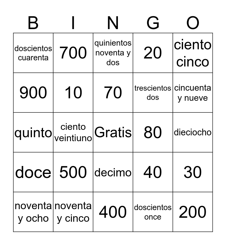 This bingo card has a free space and 51 words: 100, 200, 300, 400, 500, 600, 700, 800, 900, 1000, 10, 20, 30, 40, 50, 60, 70, 80, 90, ciento cinco, ciento veintiuno, doscientos once, doscientos cuarenta, trescientos dos, trescientos quince, cuatrocientos treinta y ocho, cincuenta y nueve, ochenta y tres, noventa y ocho, quinientos noventa y dos, seiscientos uno, setecientos ochenta y cuatro, ochocientos treinta y seis, novecientos noventa y tres, mil cien, noventa y cinco, ochenta y uno, trece, tres, catorce, dieciocho, doce, dos, Segundo, tercero, cuarto, quinto, octavo, novena, decimo and primero.