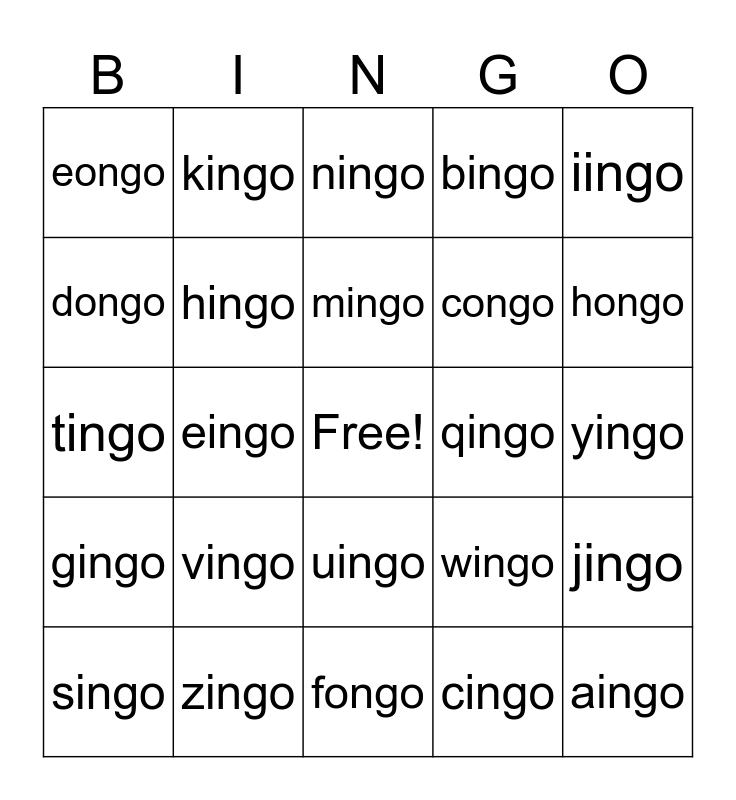 This bingo card has a free space and 32 words: cingo, dingo, eingo, fingo, gingo, hingo, iingo, jingo, kingo, lingo, mingo, ningo, oingo, pingo, qingo, ringo, singo, tingo, uingo, vingo, wingo, xingo, yingo, zingo, aingo, bingo, congo, dongo, eongo, fongo, gongo and hongo.