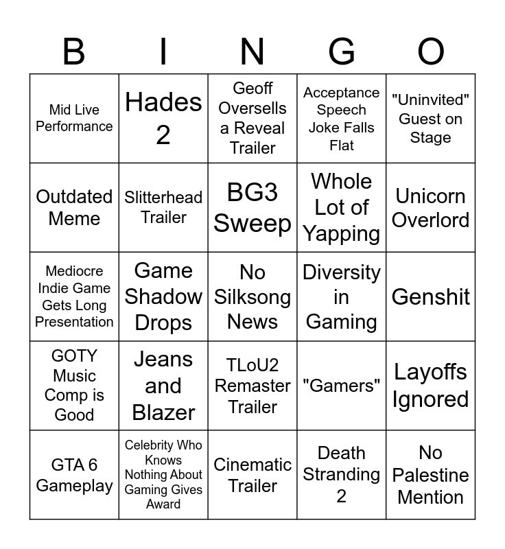 This bingo card has a free space and 24 words: Jeans and Blazer, Celebrity Who Knows Nothing About Gaming Gives Award, BG3 Sweep, GTA 6 Gameplay, "Uninvited" Guest on Stage, Mid Live Performance, Outdated Meme, Hades 2, Diversity in Gaming, TLoU2 Remaster Trailer, Whole Lot of Yapping, Mediocre Indie Game Gets Long Presentation, "Gamers", Layoffs Ignored, Slitterhead Trailer, Death Stranding 2, Genshit, Geoff Oversells a Reveal Trailer, Unicorn Overlord, Game Shadow Drops, No Palestine Mention, GOTY Music Comp is Good, Acceptance Speech Joke Falls Flat and Cinematic Trailer.
