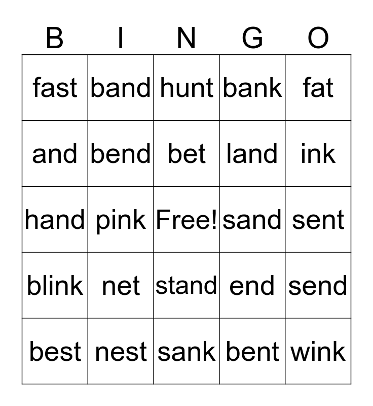 This bingo card has a free space and 24 words: net, nest, bet, best, fat, fast, and, band, sand, stand, land, hand, end, send, bend, bent, sent, hunt, ink, pink, wink, blink, bank and sank.