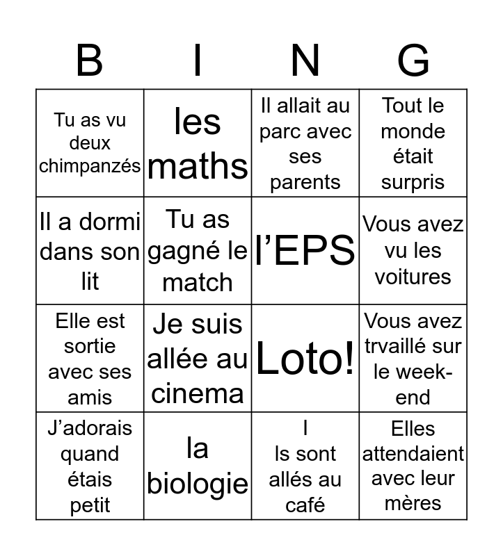 This bingo card has a free space and 15 words: J’adorais quand étais petit, Elles attendaient avec leur mères, Il allait au parc avec ses parents, Tu as vu deux chimpanzés, Vous avez vu les voitures, Il a dormi dans son lit, Je suis allée au cinema, I ls sont allés au café, Tu as gagné le match, Elle est sortie avec ses amis, Vous avez trvaillé sur le week-end, Tout le monde était surpris, l’EPS, les maths and la biologie.