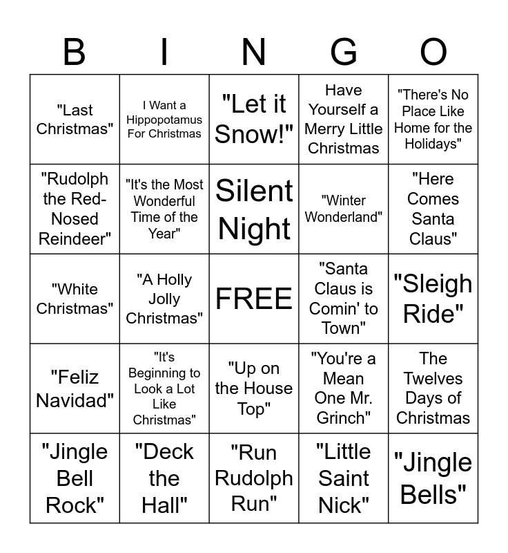 This bingo card has a free space and 29 words: "Jingle Bell Rock", "Rockin' Around the Christmas Tree", "A Holly Jolly Christmas", "All I Want for Christmas is You", "Last Christmas", "Let it Snow!", "It's the Most Wonderful Time of the Year", "It's Beginning to Look a Lot Like Christmas", "Santa Claus is Comin' to Town", "Deck the Hall", "Sleigh Ride", "Jingle Bells", "Run Rudolph Run", "Little Saint Nick", "Here Comes Santa Claus", "Frosty the Snowman", "Up on the House Top", "Feliz Navidad", "There's No Place Like Home for the Holidays", "White Christmas", "You're a Mean One Mr. Grinch", "Blue Christmas", "Winter Wonderland", "Rudolph the Red-Nosed Reindeer", Have Yourself a Merry Little Christmas, I Want a Hippopotamus For Christmas, The Twelves Days of Christmas, Silent Night and O Come All Ye Faithful.