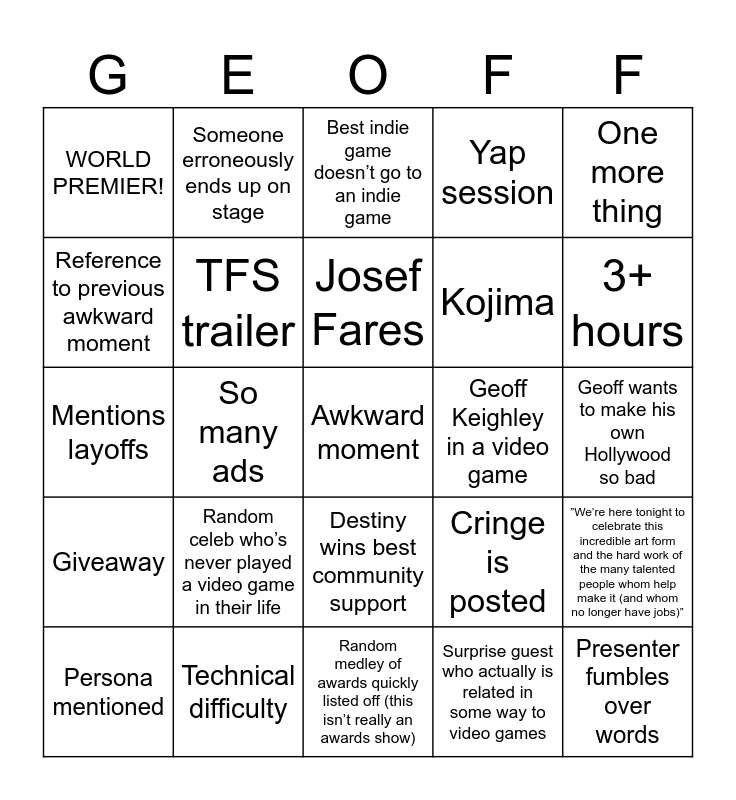 This bingo card has a free space and 24 words: Random celeb who’s never played a video game in their life, Technical difficulty, Josef Fares, Persona mentioned, One more thing, WORLD PREMIER!, Reference to previous awkward moment, Someone erroneously ends up on stage, Geoff Keighley in a video game, Destiny wins best community support, Kojima, Mentions layoffs, Cringe is posted, ”We’re here tonight to celebrate this incredible art form and the hard work of the many talented people whom help make it (and whom no longer have jobs)”, TFS trailer, Surprise guest who actually is related in some way to video games, Geoff wants to make his own Hollywood so bad, Best indie game doesn’t go to an indie game, 3+ hours, So many ads, Presenter fumbles over words, Giveaway, Yap session and Random medley of awards quickly listed off (this isn’t really an awards show).